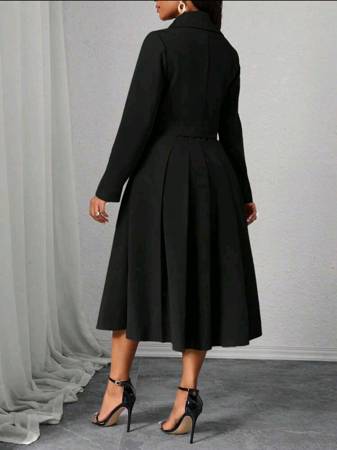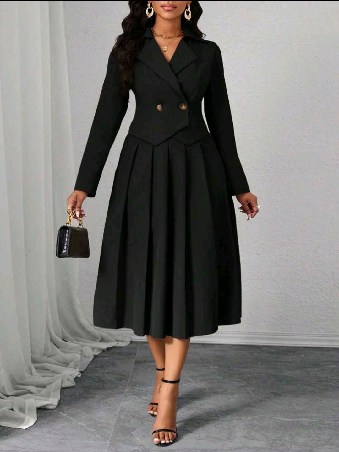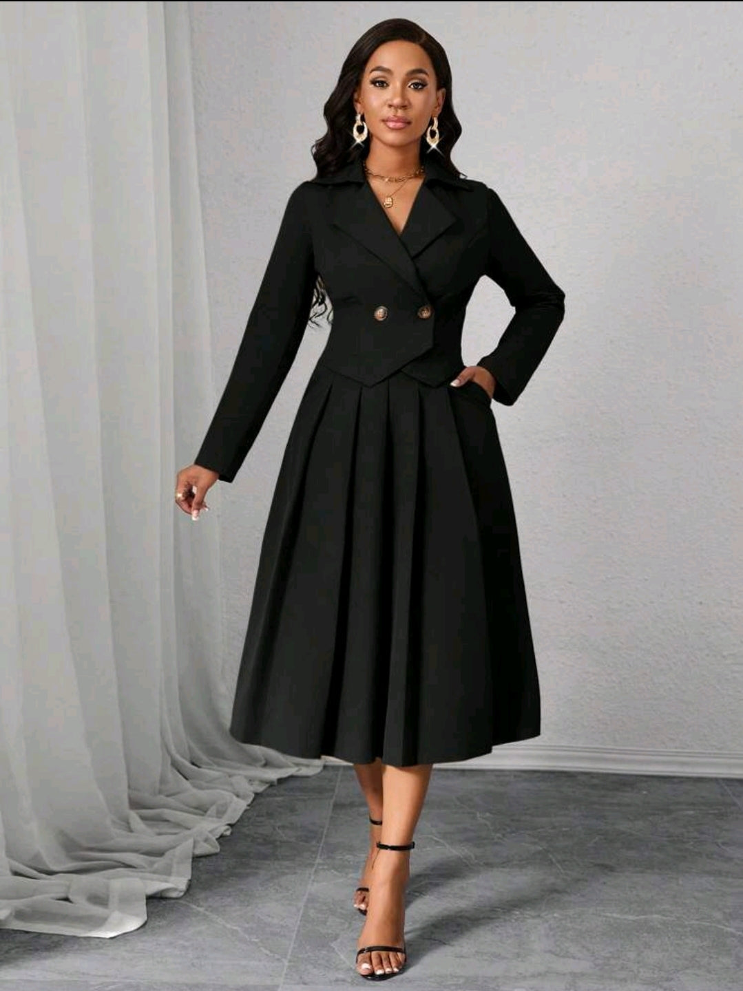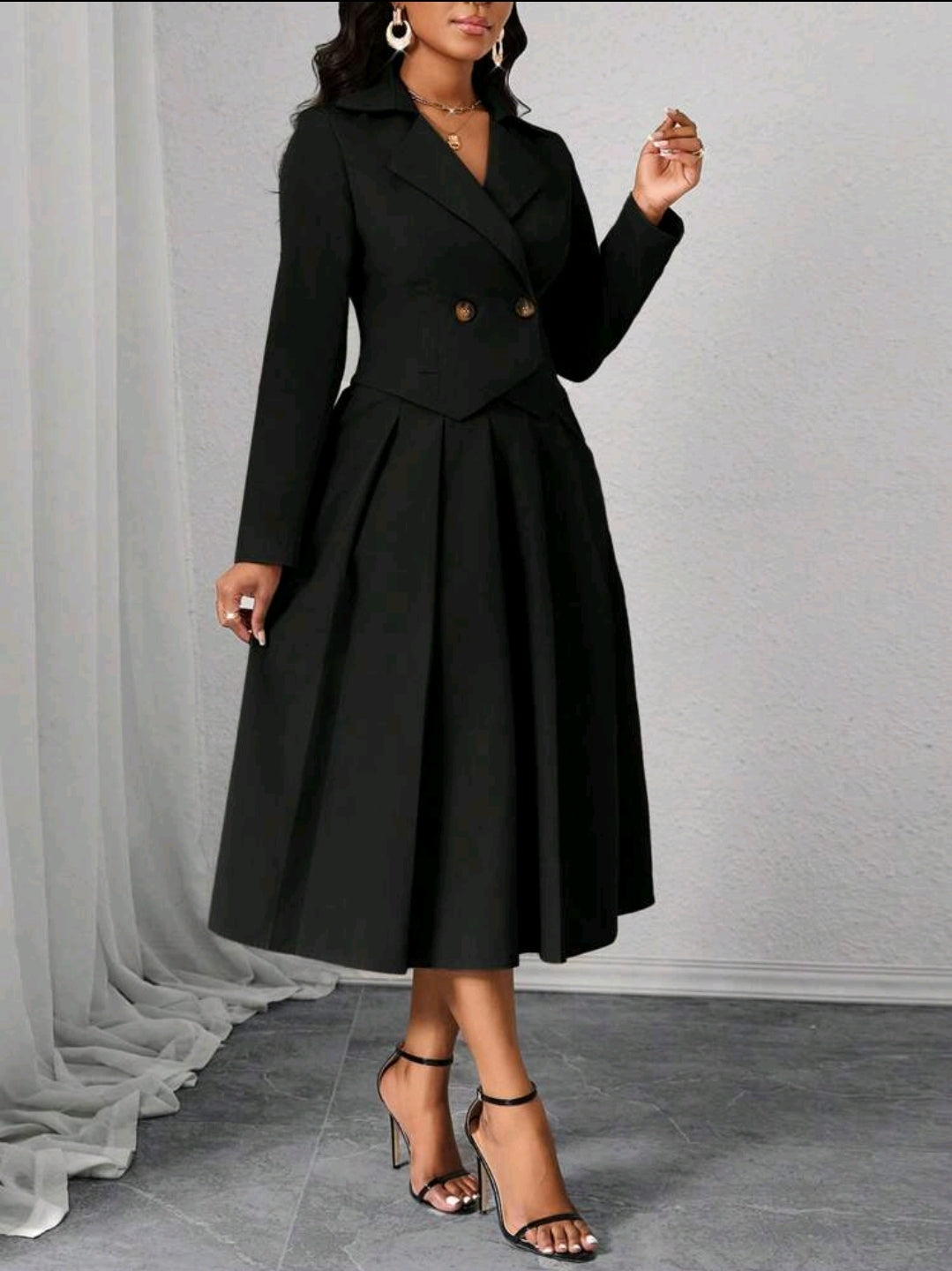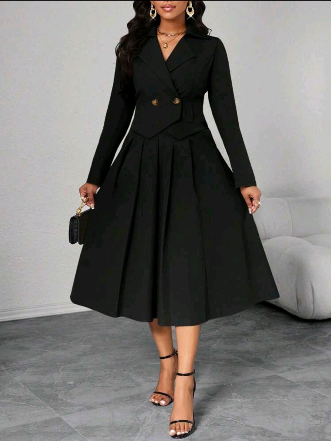 col tressé, boutons devant plissés évasés. Jupe marron, Top marron, jupe beige. Vêtements élégants pour le bureau, adaptés pour le printemps, l'été, l'automne et l'hiver.
