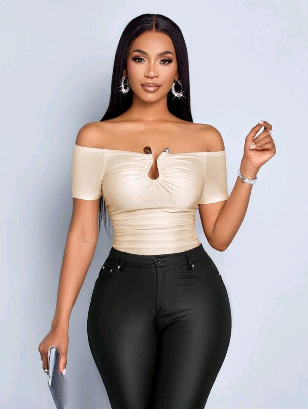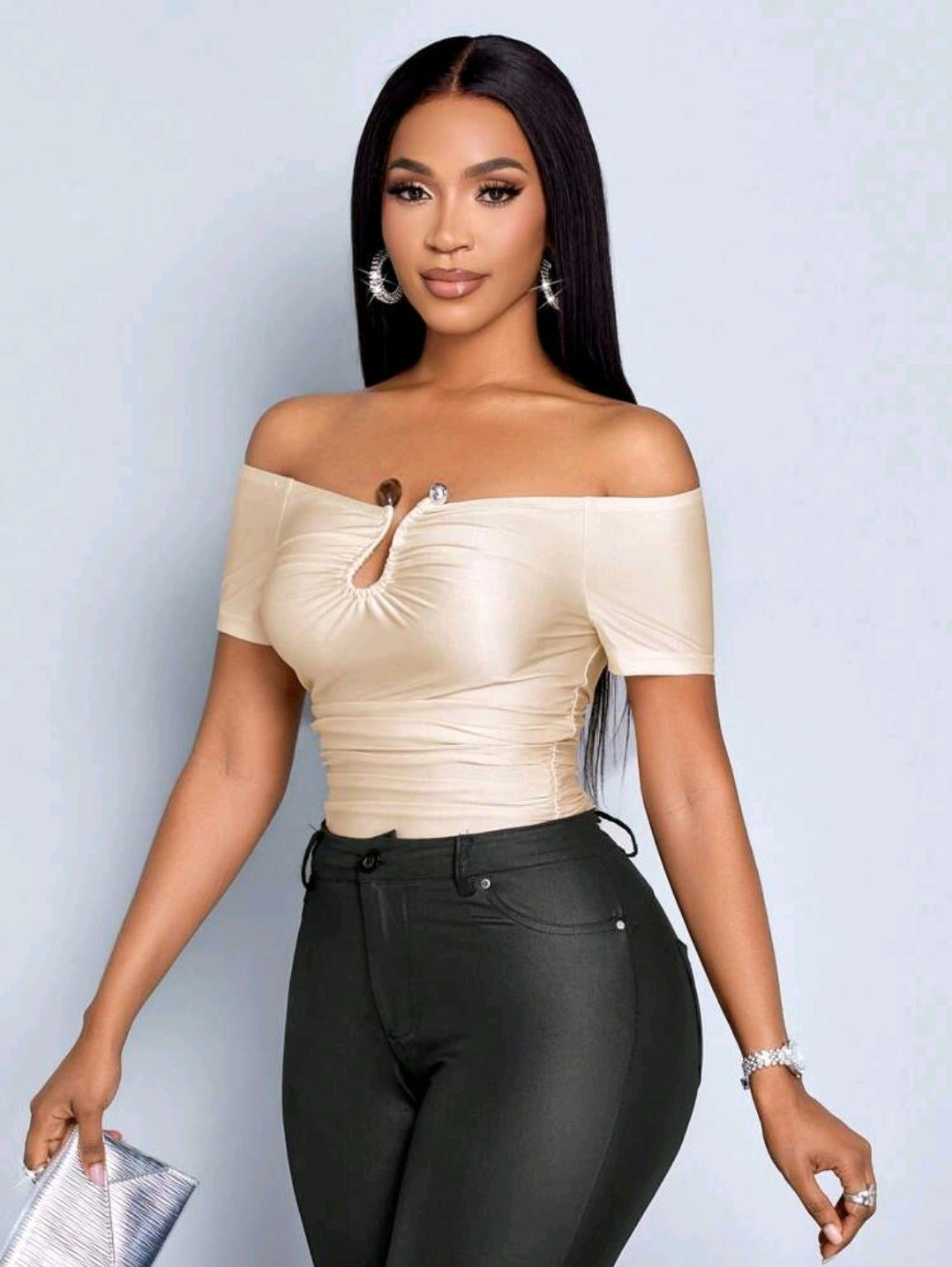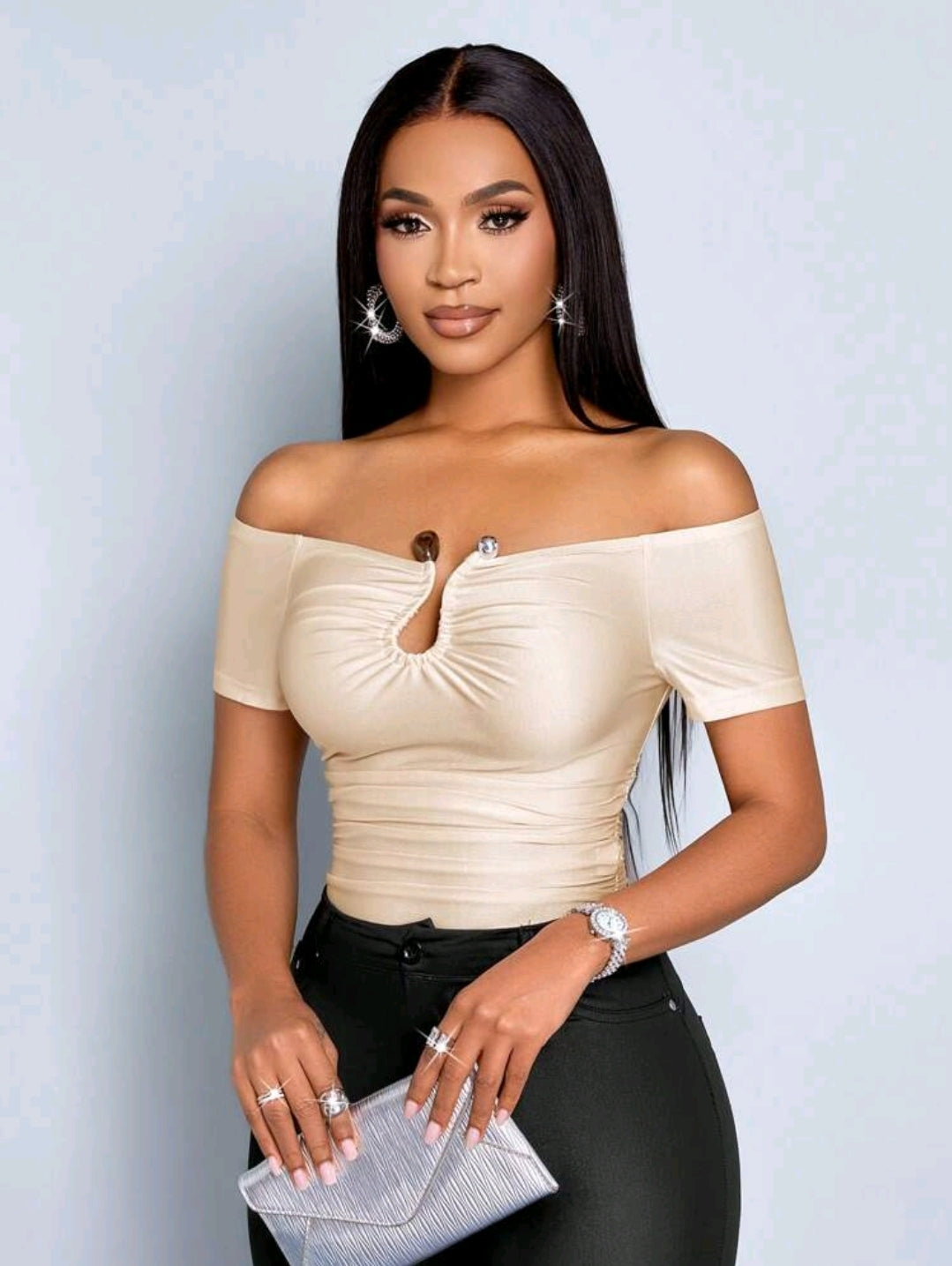 SOLERSUN Femmes T-shirt ajusté à manches courtes à épaules dénudées de couleur unie avec des plis